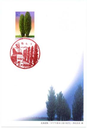 | ふるさと切手北海道版「北の風景・ポプラ並木」初日印(2001年(平成13年)9月3日発売) (平成13年用かもめーる北海道版「ポプラ並木と夏の星空」に貼付) 【消印】札幌北大病院前局風景印 切手、はがき、風景印すべて北海道大学のポプラ並木です。 |