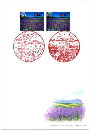 | 平成14年用かもめーる北海道版「ラベンダー畑」初日印(2002年(平成14年)年6月3日発売) (ふるさと切手北海道版「ラベンダー」50円切手貼) 【消印】(左上)上富良野局風景印、(右上)中富良野局風景印、(下)上富良野局・中富良野局風景印 上富良野局風景印は図案改正初日印でもあります(ダブル初日ですね)。 |