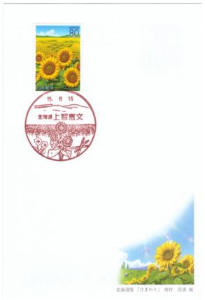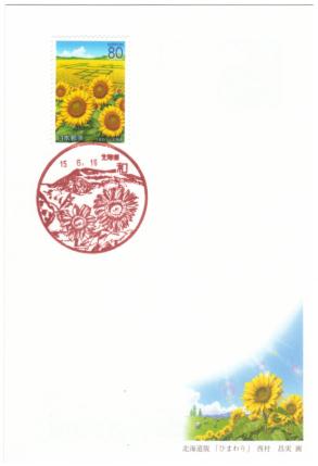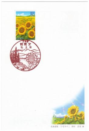 | 平成15年用かもめーる北海道版「ひまわり」初日印(2003年(平成15年)年6月16日発売) (ふるさと切手北海道版「ひまわり」80円切手貼) 【消印】(左上)和局風景印、(右上)名寄局風景印、(左中)智恵文局風景印、(右中)上智恵文局風景印、(下)和局・名寄局風景印 かもめーる「ひまわり」の原画者は、ふるさと切手「ひまわり」と同じ西村昌美さんです。 |