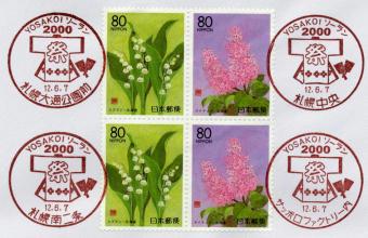 12:15 大通駅構内にある札幌中央局常設出張所「ライラックスクエア」にてカバー押印用の切手(ふるさと切手北海道版「北のロマン・花木」)を購入。そこでYOSAKOIソーランまつりのふみカードと記念台紙を購入。