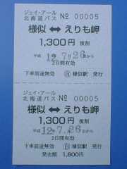 | 11:19 | 様似駅到着。JRとジェイ・アール北海道バスの乗車券売場で回数券を買おうとしたら、様似からえりも岬までの往復なら2日間有効で1,800円(片道は1,300円)の切符が7月22日から売り出されていて、もちろんそちらを買う。発売4日目ということもあって、番号がまだ5番目でした。なお、発売期間は2001年3月31日まで。発売箇所は様似駅のみです。 駅の構内には昔、スーパーが入居していましたが、撤退したため、様似町の観光案内所が入っていて、駅のスタンプと観光スタンプを押す。乗車券売場にも駅スタンプがあって、だいたい同じデザインながら、形が乗車券売場が正方形、観光案内所は丸形でした。 |