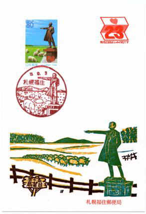 北広島元町局到着。風景印を記念押印する。「クラーク博士の切手(羊ヶ丘展望台)に「クラーク博士記念碑」が入っているので、押印しに来ました。このあと北広島に行って、あと札幌に戻って押印します」と言いました。丁重に押印のお礼をしました。