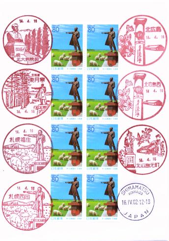 | 12:24 | 札幌北大病院前局到着。まずは北海道大学構内にあるクラーク博士像のデジカメ写真を印刷してある封筒に、同像が描かれている風景印を押す。12:37・局を出る。 |