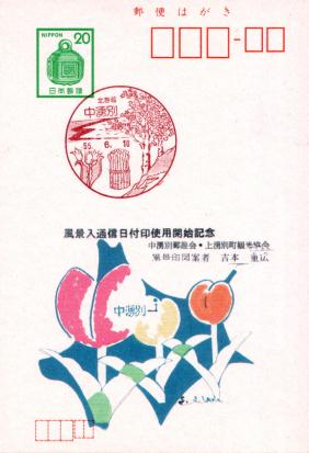 | あと、チューリップ切手10枚+チューリップ切手1枚を貼り、小型印を押した中湧別局オリジナル台紙(B5判)を1部(880円)で購入する。 私が押印しているとき、旭川の方が初代風景印使用開始のときに作った、風景印・日付印を記念押印した素敵な色紙を郵便局に贈呈していました。 その方いわく、初代の風景印は昭和55年使用開始ですが、その当時は郵政局から風景印の絵に対する注文がうるさく、題材が有名でないとボツとのこと。当初の原画では近くの山を描いていたそうですが、有名でないとのことでNGに。で、「有名な」サロマ湖を入れたそうです。旭川の方は定年まで学校勤めをで、中湧別にも勤務していたことがあり、当時の局長さんとだいぶ親しくしていたそうです。今でもその当時の局長さんがちょくちょく局に出向くことがあるとのことで、局員さんに「よろしく伝えておいてください」とことづけしてました。こういうやりとりは、ほんといいですよね。私もこれから郵便局といいお付き合いを長くしていきたいですよね。15:10局を出る。この時点で、15:17・遠軽発の特急オホーツク6号・札幌行に間に合わないことが確定(^^;。旭川の方に結局、旭川まで乗せてもらうことに(^^;;;。 |