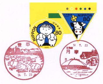 この日(7月23日)はふみの日(&世界遺産シリーズ第8集切手)の切手発売日。北海道ではここ数年、ふみの日小型印は使用されず、記念押印も特印のみでしたが、今回のデザインで、羊、牛、サッカー、テニスは札幌市内の郵便局で使われている風景印に入っているので、風景印押印のための局廻りをすることにしました。なお、切手はあらかじめ昼休みに札幌大通郵便局で購入し、ふみの日特印(手押し)だけは記念押印を済ませました。そのため、昼食をとることができず(^^;。 |