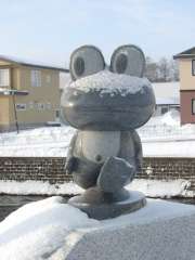 | 8:00 | 弟子屈局に向かう途中、川に架かる橋の欄干になぜか「カエル」がいました。この「カエル」がなぜここにいるのか、意味不明(^^;。 |