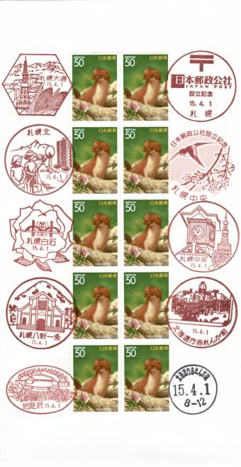 この日は郵政事業庁が「日本郵政公社」としてスタートを切った日。その日に合わせて、郵政公社ではシール式・10枚綴りの「日本郵政公社創立」記念切手と3事業のマスコットキャラクターが描かれたシール式・12枚綴りの普通切手を発売。そして、北海道では19局で新風景印を使用(図案改正17局、新規使用2局。局名改称のみで図案変更なしの旭川近文局(旧・近文駅前局)は除く)。うち、札幌市内では札幌中央局、札幌大通局、そして私が切手収集開始したときに住んでいた白石区の集配局である札幌白石局など6局で図案改正・新規使用となり、ここはもちろん全部制覇のため、年度初めの状況ながら午前中に休暇をとって局廻りを敢行(^^;。 |