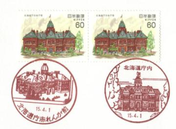 | 11:07 | 「元祖」北海道庁内局の風景印を押す。カバーでは赤れんが切手(近代洋風建築シリーズ、ふるさと切手)2枚貼りに北海道庁赤れんが前局と北海道庁内局の風景印を押した2局印カバーを完成させる。 |