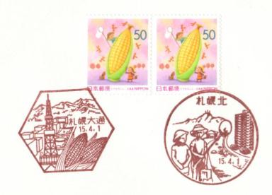 | 11:44 | 札幌北局到着(運賃1,240円)。風景印押印は郵便窓口前の特設カウンターにて新旧風景印押し記念たとう販売とともに行っていて、風景印を押印。ふるさと切手「THE北海道」の「とうもろこし」切手が札幌北局風景印に登場の虫取り風景(昆虫採集)があるため、とうもろこし風景印の札幌大通局のと併印する(^^)。たとうもついでに購入(1部400円)。なお、虫取り風景の彫刻「夏の日」は風景印に描かれている安春川沿いにあるそうです。いつか、彫刻をチェックしたいと思います。 |