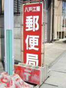 | 13:20 | (8)八戸江陽局 「〒」マークだけ抜いて赤塗りしたブロックを重石にして、いわゆる商店にあるような小さな看板も置いてありました(^^)。 |