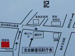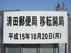 | 9:58 | このあと旧・清田局舎に寄ってみる。もちろん、「清田郵便局」の文字は取り外されており、局前には工事のため業者の方が作業を始めようとしているところでした。しっかり、移転の案内の看板を撮影する(地図は左側が北)。看板でも「新庁舎」の位置は「林ビル1F(建設中)」となってますね(^^;。 |