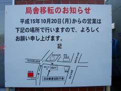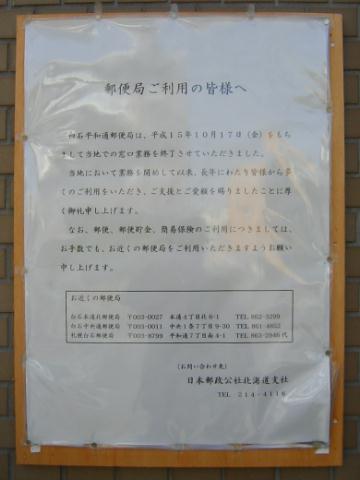 | 12:34 | 営業を終えた白石平和通局の局舎に寄ったところ、張り紙が変わってました。局名の立て看板は撤去されていたものの、建物にある「白石平和通郵便局」の表示はそのままでした。いつもならすぐに取り外されるのですが…。あと、近くの局の案内も一応してはいますけど、住所だけじゃ見てもわからない方がいるのでは…。わかりやすくするなら簡単でいいから地図で近くの郵便局の位置を表示すべきだと思います。ちょっと配慮に欠けていますね。 |