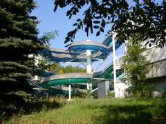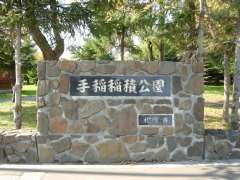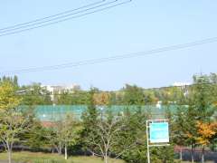 | 11:48 | JR稲積公園駅に戻る途中、手稲稲積局風景印に描かれている、手稲稲積公園に寄り、ていねプールのウォータースライダー(左下)とテニスコート(右下)を撮影する。テニスコートは稲積公園駅近くの歩道橋からの撮影ですが、木々に囲まれているため、テニスコートかどうかわからない写真ですね(^^;。 |