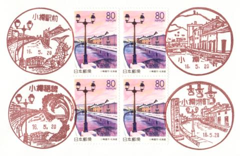 (2)小樽局 絵入り葉書「北海道セレクション」の「小樽運河」葉書に小樽運河風景印を押す。 |