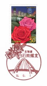 | 12:32 | 白石南郷北局到着。今日発売のふるさと切手「神奈川県の花」に登場の「ばら」切手にバラ風景印を押印する。12:38・局を出る。 |