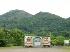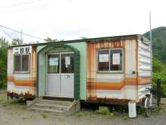 | 9:18 | 二股駅到着。降りた客は私ひとり(^^;。駅舎は昔のコンテナを利用。 |