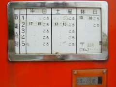| 12:13 | やっと局を出る。局には3時間近くいました。局長さんからはホットコーヒーをごちそうになってしまいました(^^;。午前中は私以外に押印客が3人。そして近所のお客さまも数人来てました。また、国道5号線沿いにあるので、ATM利用しようとして、窓口払いによる払い出しの客が2人いました。ポストには明日・6月26日(土)から平日・土曜の取集が2回から1回(11時頃の取集)に変更となる張り紙がありました。ということで、このポストにおける最後の「(次の)取集は2号便」表示をデジカメ撮影(^^;。 |