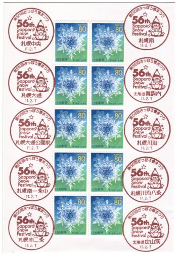 | 16:45 | (9)札幌大通局 切手貼り作業、ラストの札幌中央局に到着。小型印を押印。これでさっぽろ雪まつり10局印カバーの完成です(^^)。押印後はあらかじめ、札幌中央局押印分でまだ切手未貼付のものを貼る。17時10分・局を出る。 |