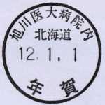 旭川医大病院内簡易局(〒078−8307旭川市)で、レタックスで年賀扱いのときに押される年賀用のスタンプ(通信日付印ではありません)を誤って切手に記念押印したものを入手しました。