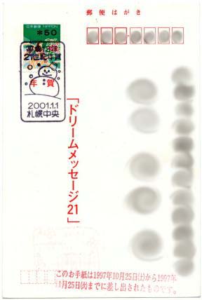 追加:JPS札幌中央支部長である、北林利仁さんに1通の「ドリームメッセージ21」が届いたそうですが、消印が札幌西局の21世紀年賀とのことでした。札幌市西区在住ということで、札幌西局の消印が押されたのでしょうか?もし、「ドリームメッセージ21」を受け取った方がおりましたら、どんな消印が押されたか、掲示板かメールで教えていただければ幸いです。
