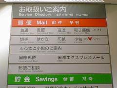 札幌丸井内局における中国語・ハングル語での表示は、上記の看板については、大きな分野(郵便、貯金、保険)までのようで、例えば郵便の中でも、細かな分野(普通、書留、速達、切手など)は、スペースの関係もあってか、外国語表記は英語のみでした。