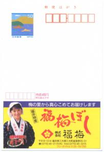 昨年発売された北海道版エコーはがき「(株)福梅」(2000.9.21発売)ですが、今年発売の石川版エコーはがき(2001.5.15発売)でも同じ図柄で登場していました。ただし、葉書の用紙が北海道版がケナフパルプ、石川版が再生紙と異なるため、区別可能です。