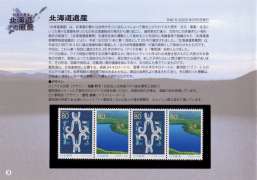 で、各題材4枚ずつ(4種連刷は1枚ずつ、2種連刷は2枚ずつ、「流氷とガリンコ号」は4枚入り)がマウントに入っていて、価格は2,180円(80円切手26枚、50円切手2枚)です。原画では切手では描かれていない部分が入っていたりと、非常に興味深い内容となっています。ただ、「北海道の風景」とうたいながら、「北の大地」「北の大地II」「北の彩り」などが入っていないのは、それらは既に完売で、在庫がある切手のみでの切手帳制作をした…ということで、見方を変えれば、「在庫処分」的な売り方という感じも受けてしまいます。(2005.2.14提供) |