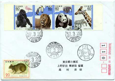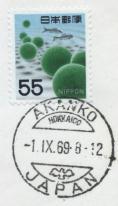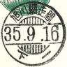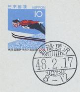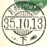 東札幌駅前は現在の白石菊水三条局です(昭和52.12.1改称)。現在、東札幌駅は札幌市地下鉄東西線の駅名にありますが、郵便局の名前にある「東札幌駅」は国鉄時代の旧千歳線の駅でした。苗穂−東札幌−月寒(つきさっぷ)−大谷地−上野幌(旧)と経由していましたが、昭和48年9月9日に千歳線が苗穂−白石−(平和…昭和61.11.1開業)−新札幌−上野幌(新)というルートに変更され、大谷地駅と旧・上野幌駅は同日で廃止、白石−東札幌−月寒間は貨物線として存続しましたが、月寒駅は昭和51年10月1日に廃止され、東札幌駅も昭和61年11月1日に廃止されました。月寒駅前局も以前ありましたが、東札幌駅前局の名前が消えた日と同じ、昭和52年12月1日に白石栄通西局と局名改称されています。このローラー印は横溝忠則さんのところにて、わずか30円でGETしました。なお、横溝さんのところには、切手に合わせた風景印や小型印などを押したカバーが格安で販売していました。私も同じように集めているから、そういうものを出しているとすごく嬉しいですし、見るだけで楽しいですね(^^)。