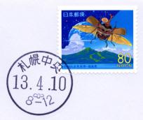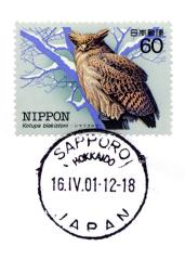 コンサドーレ札幌のマスコットキャラクター「ドーレくん」がシマフクロウなので、今回もシマフクロウ切手に札幌中央局の欧文印(「SAPPORO」と「HOKKAIDO」の両方が入っているのがいいですね)を押しました。 北海道郵政局ホームページ・北海道の風景印めぐり 風景印の図案にちなんだ写真や切手なども紹介されていて、見るだけでもすごく楽しいです。私は掲載局をプリントアウトしたいところですが、する時間がないですね(^^;。(2001.4.16更新) |