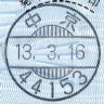 今年3月に新しく入ったこのインク浸透式印ですが、消印を押したとき、時刻部分とリング(日付印の輪)の間隔が約2.5mmと、平成11年に試行配備されたもの(約2mm)より広いので、よく見れば区別可能です。(2001.4.19更新) |