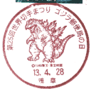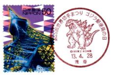 ゴジラ小型印ですが、20世紀デザイン切手第9集「ゴジラ」切手に押印するのはもちろんとして、同じシートの中にある「東京タワー」切手(2種連刷の右側)の右側に押印すると…。