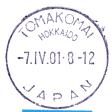 | 9:50 | 苫小牧局でインク浸透式印を使用しているかを聞いてみると、まだ使っていないとのこと。欧文印(下図・左)を記念押印する。 ※ 実はこの日の夜、札幌中央局の私書箱を開けたところ、苫小牧局からインク浸透式和文印を返信用葉書に押して戻ってきていたので、既に使用中でした。 |