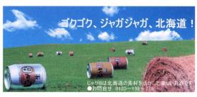 牧草地に牧草ロールとともに、「じゃがB」などの缶が横になって、まるで牧草ロールになっている状態の合成写真です。まさしく、北海道ならではの広告ですね。今年のエコー葉書北海道版の広告大賞ですね(勝手に賞を作ってしまった(^^;)。なお、左手前にある銀色の缶が、「じゃがBなまらドライ」(スーパーのことを北海道弁で「なまら」と言います。アサヒのスーパードライ「SUPER DRY」の部分が、字体もいっしょで「NAMARA DRY」になっていて、「生」の下には「ナマラドライ」と書かれているのも、なまらいい(^^;。 日高ビールホームページ |