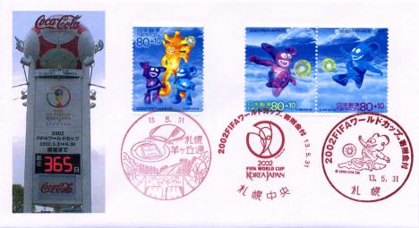 この画像を初日カバーのカシェに使って、記念押印します。(2001.5.31(7:05)更新) 上の画像をホームページに紹介したあと、その画像を洋形7号封筒に印刷して、再び家を出て、2002FIFAワールドカップ寄附金付切手の記念押印をしました。特印・手押し−札幌大通局(局名表示「札幌」…札幌中央局でも同じ消印が押印できますが、記念押印している収集家がたくさんいるので、手押しの特印は札幌大通局でしました)。特印・機械−札幌中央局。風景印−札幌羊ヶ丘通局(札幌市清田区。開催会場の札幌ドームが描かれています(5月31日現在で札幌ドームを描いた風景印は1局のみ))。