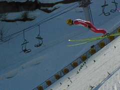 71番・渡瀬雄太選手も130.5mと130m越えジャンプ。テレマークが決まり、飛型点が高得点でトップにたつ。76番・吉岡和也選手は135mまで距離を伸ばし、トップが入れ替わる。昨日優勝の77番・東輝選手はやや失敗ジャンプ。それでも距離は133mまで伸ばすものの、余裕がなかったためテレマークを決められず、この時点で順位は5位。そして、1本目ラストの83番・岡部孝信選手は138mまで距離を伸ばし、トップに。なんと1本目で130m越えジャンプが6本も飛び出す面白い試合に。これも大倉山の風が選手によっていい向かい風だったからですね。 |