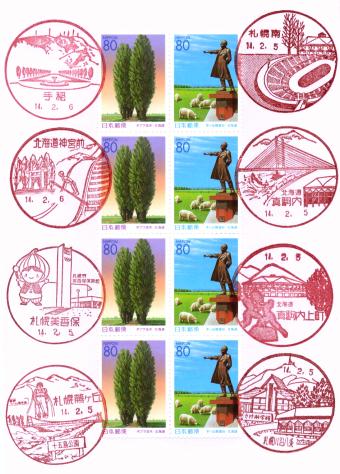 ●札幌五輪ジャンプで日の丸3本から30年 今日は札幌にとって特別の日。あの札幌五輪・70m級ジャンプで笠谷選手、金野選手、青地選手が金・銀・銅の表彰台独占、日の丸が3本立ったという日本スポーツ界にとって五輪初快挙を成し遂げました。この快挙はその後に行われた夏季・冬季五輪で再現されたことはなく、歴史的な1日となりました。 その歴史的な1日からちょうど30年。宮の森ジャンプ場の風景印はありませんが、大倉山ジャンプ場が描かれている北海道神宮前局に行き、記念押印してきました。時間に余裕があれば、札幌宮の森局の欧文印も併印したかったです。和文印でもいいけど「MIYANOMORI」というローマ字の方がオリンピックにちなんだ記念押印らしい(^^;。ま、いつかの年の2月6日に決行しましょう(^^)。