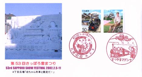さっぽろ雪まつりの「スペシャルカバー」ができ上がりました。松山が題材の「坊っちゃん列車と競走だ!」雪像のデジカメ画像を封筒にカシェとして印刷し、ふるさと切手「歴史と文化の息吹くまち松山」に2月5日付「さっぽろ雪まつり」小型印を押したあと、まつやまマドンナ郵便局に速達で郵頼したところ、今日戻ってきました。まつやまマドンナ局の風景印は松山城、坊ちゃん列車、マドンナと今回の雪像に全部登場していますので、今回の雪像にとっての「完全適正風景印」ですよね(^^)。