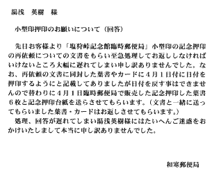 和寒郵便局 御中 小型印押印のお願い(再々依頼) 貴局で4月1日より使用開始の「塩狩峠記念館臨時郵便局」小型印押印依頼について、再依頼をしたところ、過去の日付にさかのぼっての押印ができないため、局の手持ち分に小型印を押した葉書・台紙を送っていただきました。この対応は納得がいきません。 収集している者としては、小型印が押してあるものであれば何でもいいわけではなく、押している台葉書・切手にもこだわって集めています。そういうことを無視して、こちらの用意したものでないものを電話等であらかじめ断りもなく、送るのは郵便局の独断的な対応です。 そもそも、4月1日の段階で押印失敗したとき、誠意ある対応を郵便局側がしているならば、 (1)葉書については、同じ葉書を用意して、その葉書に押し直す。 (2)切手貼りカードの場合、失敗についてお詫びするとともに、同じものを再度送ってもらうよう電話等でお願いして、届いた段階で、それに使用開始日の日付にて押し直す。 などの対応をするでしょう。そういうこともせずに押印失敗したものを平然で送り、こちらからの再押印の依頼を長期間放置し、そして、こちらの要望を無視した誠意のない対応をそのまま受け入れるわけにはいきません。 本来、郵便局側がきちんと押印していれば入手することができるはずであった、切手貼りカードにきちんと4月1日付小型印を押していただくようお願いします。また、せっかくお送りいただいた記念台紙は当方不要ですので、お返しいたします。 当方は切手貼りカードに小型印を押してもらう方法で、平成元年から北海道内の郵便局で使われている小型印を全部集めています。失敗した対応を棚に上げて、押印拒否した局は貴局が初めてであることをお知らせいたします。 また、今回の誠意のない対応について、北海道郵政監察局に指摘するとともに、当方で制作しているインターネットサイト(ホームページ)にて報告、そして今回、和寒局に小型印を郵頼した方に、和寒局がどのような対応をしたのか調査し、ホームページで紹介することも合わせてお知らせいたします。 |