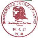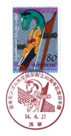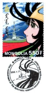 そして、モンゴルでの日本との外交関係30周年記念切手がこのスタンプショウに合わせて、4月27日から発売し、会場でも発売となりました。記念切手の原画者は松本零士さんです。また、会場では、記念切手用の記念スタンプ(右)とスタンプショウ用の記念スタンプ(左)の2種類が用意されていました。 |