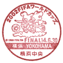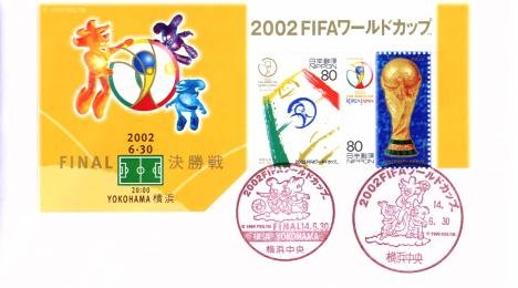今回、横浜中央郵便局に6月30日付のワールドカップ小型印、特印を郵頼しました。さすがに現地に行って、決勝版シートを使った記念押印はできませんので、全国版と横浜会場版のシート耳紙一部を使ったW杯決勝記念カバーをつくりました。シートの耳紙もこういうタイプならカバーに切手ともに貼って、きれいなカバーを作ることができますよね。(郵頼は7月3日到着)(2002.7.12提供) |