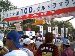 | 5:00 | スターターである湧別町長のピストル一発でいよいよサロマ湖100kmウルトラマラソンの長い走りがスタートする。前半は普段、フルマラソンで走っているペースくらいで飛ばし、後半は前半でつくった貯金を生かし、気楽な気持ち(たくさん歩いても、制限時間・13時間以内で完走できる状況)で走ろう、という「めちゃくちゃ」な作戦です。普通なら、後半に備えて前半はやや抑え目で走るのですが、昨年は42.195km地点が4時間45分56秒と慎重に慎重を喫して走ったのですが、結局足が持たず、69km地点でリタイア(70km地点で制限時間に通過することが不可能となったため)。早く走っても、ゆっくり走っても、いずれは足が持たなくなるかもしれない、という状況なら足の状態がいいうちに飛ばして「貯金をつくる」方が、今の私にとっては「完走する」ことが最大目標なので、その目標を達成するための最前の作戦、と判断しました。 |