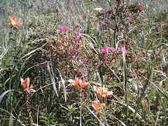 | 14:52 | 85km地点を通過。あと15km。ここからが長い(^^;。原生花園の東側では盛りが過ぎたハマナスやエゾスカシユリがかろうじて少し咲いていたので、薄型デジカメでパチリ。 |
