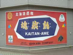 | 8:25 | 赤平駅前にある石川商店の看板で赤平名産「塊炭飴(かいたんあめ)」をデジカメ撮影する。 |