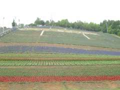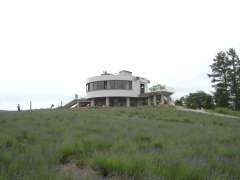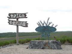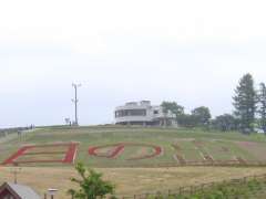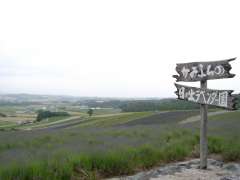 | 12:40 | 日の出ラベンダー園に到着。丘の上にある展望台まで歩いていく。途中で上富良野局の風景印に描かれている「日の出ラベンダー園」の看板を見つけ、デジカメ撮影する。 |