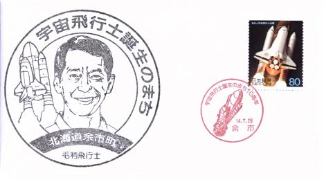 で、今回私が押印した葉書・カバー類を紹介します。毛利さんの似顔絵入りのスタンプを押して、スペースシャトル切手に小型印を押したカバーは、スタンプと小型印のタイトル的にもマッチしているので、本当にお気に入りです(^^)。