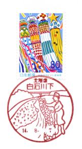 このあと、都市間高速バス「ポテトライナー」で帯広に行って、帯広郵便局で今日まで使用の「絵手紙たなばた祭り」小型印を記念押印します。そして、明日はふるさと銀河線沿線の郵便局廻り、そして上常呂郵便局の風景印初日印を押しに行きます。(2002.8.7提供) |