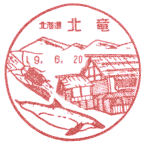 | 11:21 | 石狩沼田駅から国道275号線を4.5km進んで北竜簡易郵便局(旧北竜郵便局局舎)に到着し、局舎を撮影する。北竜簡易局は1997.7.1開局で、1997.6.20までは北竜局でした。で、北竜局廃止まで風景印を使用していました。北竜局の風景印(1994.7.23使用開始〜1997.6.20使用終了(廃止による))に描かれているのは「本願寺駅逓、ヘイケボタル、ネズミイルカ」です。ネズミイルカは沼田町内に流れる幌新太刀別川にかかる五箇山橋上流で約500万年前の深川層郡幌加尾白利加層よりネズミイルカの化石を1985年に産出。最近の研究で新種であることが確定し、「ヌマタネズミイルカ」と命名されたことにちなみ、描かれているものです。