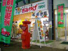 | 12:52 | 北竜(北竜町役場バス停)からの札幌行バスの発車時間が迫っている中、北竜町特産品販売所に寄ったところ、和郵便局の臨時郵便局「ひまわり郵便局」があり、なんと臨時郵便局前に丸形ポストがありました(^^)。臨時郵便局に丸形ポストが置いてあるところは、判明分で上湧別町の「チューリップ郵便局」に続き、2箇所目。それも4月25日発売の「北の彩り」に登場のチューリップ、ひまわりともに、臨時郵便局があり、丸形ポストも置いてあるおまけつき。ただし、デジカメのリチウム電池の残りがわずかで、このあと北竜町役場前の丸形ポスト撮影もあるため、多くの枚数は取れず(^^;。臨時郵便局では「ひまわりの里」オリジナル絵はがき8枚セット(500円)を買う。 |