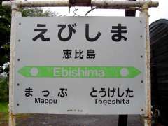 | 9:44 | SLすずらん号が恵比島駅(明日萌駅)に到着。ホームには恵比島駅の駅名標と「明日萌駅」の駅名標の両方がありました。 で、「すずらん」のロケで「明日萌駅」として使われた駅舎前にある丸形ポストに行ったのですが、SL乗客が続々、駅前で記念撮影しているため、丸形ポストの撮影はSLすずらん号発車後ですることに。 |