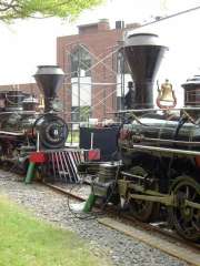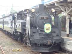 いろんな関係者からのスピーチがあったあと、いよいよ除幕式。「義経号」「しづか号」とも蒸気らしきものが上がっていますが、これは本物じゃないですね…あ、さっき写真をとったときの「足もと」に緑のボンベがあったのは、序幕したときに「蒸気」を上げるための「ガス」だったんですね。納得(^^)。 |